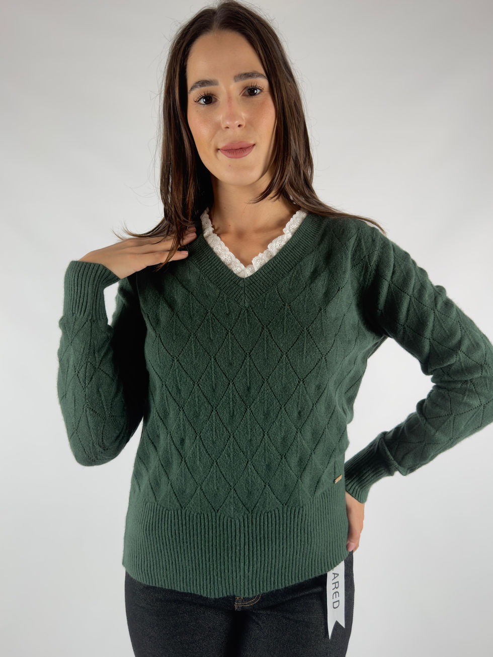 Camisola com um padrão em losangos na parte da frente e nas mangas. Tem um decote em V, com uma borda branca rendada a contrastar. As extremidades das mangas e a barra inferior têm um acabamento em malha canelada. Disponível em várias cores.