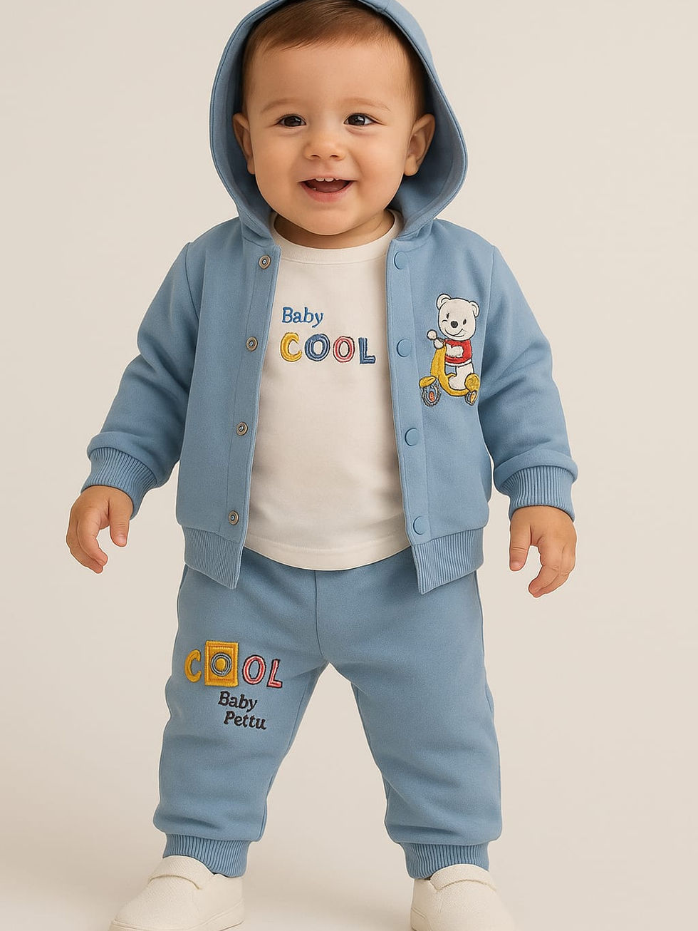 Este conjunto é a escolha perfeita para os mais pequenos, que buscam adicionar um toque de estilo aconchegante e muita diversão ao seu guarda-roupa. Com um casaco azul vibrante, que combina com as calças, e uma t-shirt branca, este conjunto apresenta uma estampa central carismática de um ursinho divertido a andar de moto. As palavras coloridas "Baby Cool" na t-shirt e nas calças complementam o visual, conferindo um charme inigualável e um espírito aventureiro.